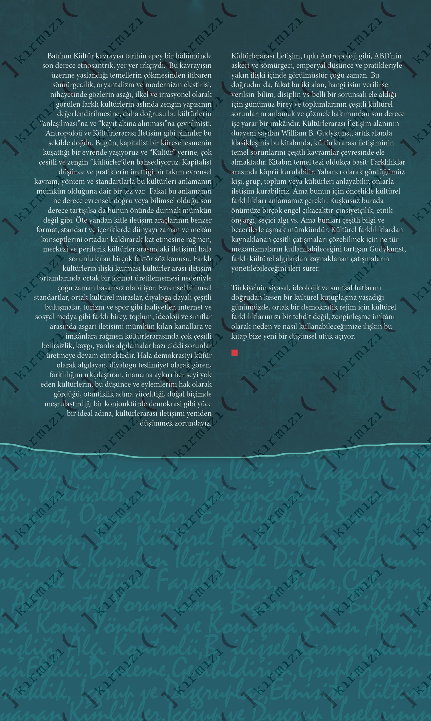 Kültürlerarası İletişim, tıpkı Antropoloji gibi, ABD’nin askeri ve sömürgeci, emperyal düşünce ve pratikleriyle yakın ilişki içinde görülmüştür çoğu zaman. Bu doğrudur da, fakat bu iki alan, hangi isim verilirse verilsin-bilim, disiplin vs-belli bir sorunsalı ele aldığı için günümüz birey ve toplumlarının çeşitli kültürel sorunlarını anlamak ve çözmek bakımından son derece işe yarar bir imkândır. Kültürlerarası İletişim alanının duayeni sayılan William B. Gudykunst, artık alanda klasikleşmiş bu kitabında, kültürlerarası iletişiminin temel sorunlarını çeşitli kavramlar çevresinde ele almaktadır. Kitabın temel tezi oldukça basit: Farklılıklar arasında köprü kurulabilir. Yabancı olarak gördüğümüz kişi, grup, toplum veya kültürleri anlayabilir, onlarla iletişim kurabiliriz. Ama bunun için öncelikle kültürel farklılıkları anlamamız gerekir. Kuşkusuz burada önümüze birçok engel çıkacaktır-cinsiyetçilik, etnik önyargı, seçici algı vs. Ama bunları çeşitli bilgi ve becerilerle aşmak mümkündür. Kültürel farklılıklardan kaynaklanan çeşitli çatışmaları çözebilmek için ne tür mekanizmaların kullanılabileceğini tartışan Gudykunst, farklı kültürel algılardan kaynaklanan çatışmaların yönetilebileceğini ileri sürer.