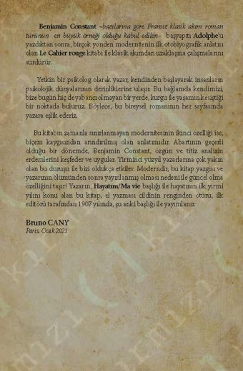 Benjamin Constant –bazılarına göre Fransız klasik akım roman türünün en büyük örneği olduğu kabul edilen– başyapıtı Adolphe‘u yazdıktan sonra, birçok yönden modernitenin ilk otobiyografik anlatısı olan Le Cahier rouge kitabı ile klasik akımdan uzaklaşma çalışmalarını sürdürür.Yetkin bir psikolog olarak yazar, kendinden başlayarak insanların psikolojik dünyalarının derinliklerine ulaşır. Bu bağlamda kendimizi, bize bugün hiç de yabancı olmayan bir yerde, kurgu ile yaşamın kesiştiği bir noktada buluruz. Böylece, bu bireysel romanının her sayfasında yazara eşlik ederiz.Bu kitabın zamanla sınırlanmayan modernitesinin ikinci özelliği ise, biçem kaygısından arındırılmış olan anlatımıdır. Abartının geçerli olduğu bir dönemde, Benjamin Constant, özgün ve titiz analizin erdemlerini keşfeder ve uygular. Yirminci yüzyıl yazarlarına çok yakın olan bu duruşu ile bizi oldukça etkiler.Moderndir, bu kitap yazgısı ve yazarının ölümünden sonra yayınlanmış olması nedeni ile güncel olma özelliğini taşır!Yazarın, Hayatım/Ma vie başlığı ile hayatının ilk yirmi yılını konu alan bu kitap, el yazması cildinin renginden ötürü, ilk editörü tarafından 1907 yılında, şu anki başlığı ile yayımlanır.Bruno CanyParis, Ocak 2021