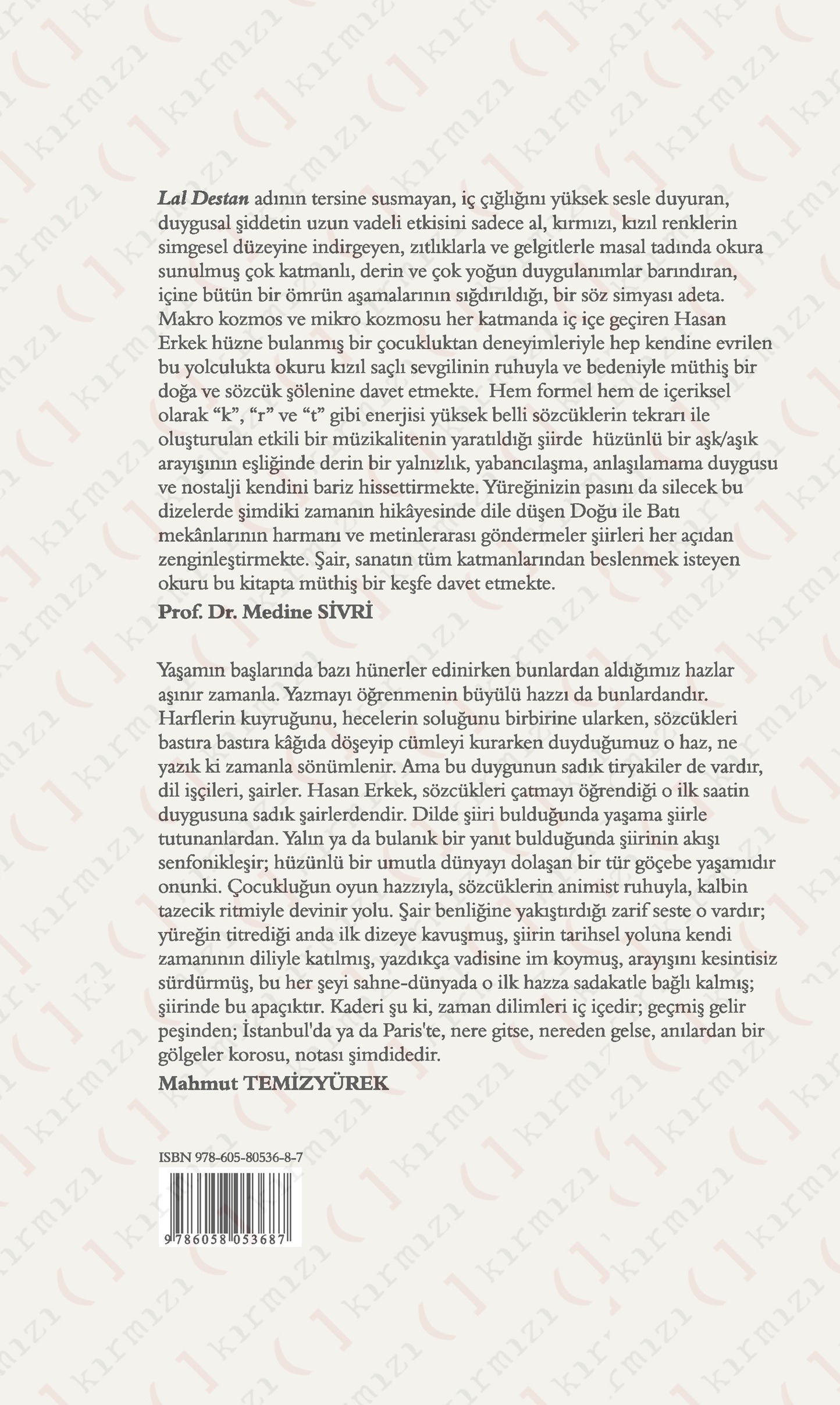 Hasan Erkek’in beşinci şiir kitabı Lal Destan Kırmızı Yayınları tarafından yayımlandı. Geniş oylumlu bir kitap olan Lal Destan’ın kapağında ise, Emin Güler’in bir resmi yer aldı. Lal Destan, şiir başlıklarından da anlaşılabileceği gibi, otobiyografi, öykü, roman, destan, fars, taşlama, anı, yazıt gibi türlerle, resim, müzik, sinema gibi sanat biçimlerini kendine dayanak yapan şiirlerden oluşmaktadır. Şair yalnız her şiirine özgün bir yapı oluşturmakla kalmayıp kitabına da sağlam bir yapı kurmuştur.