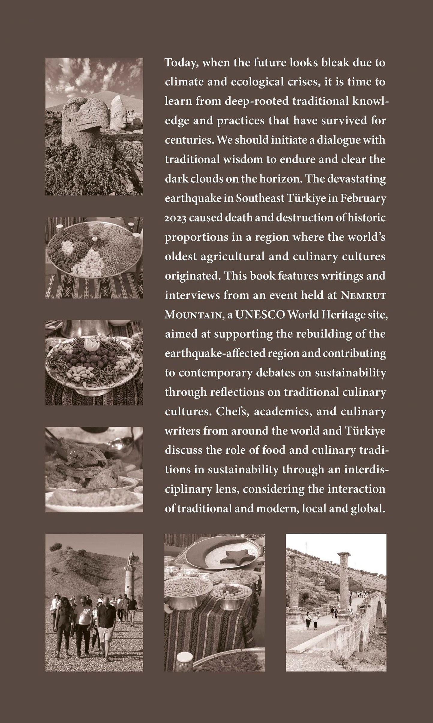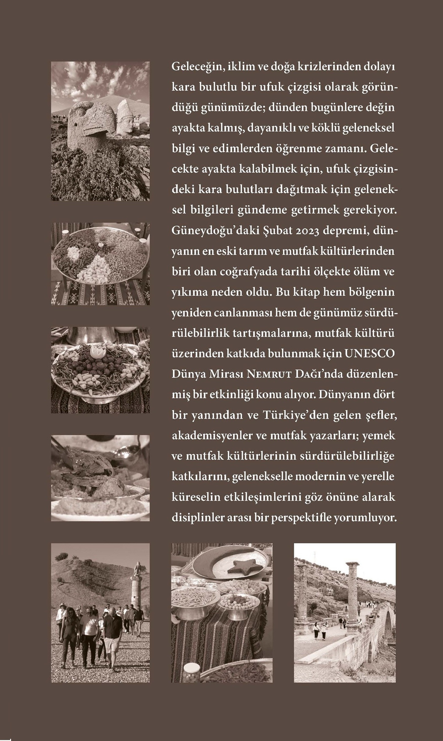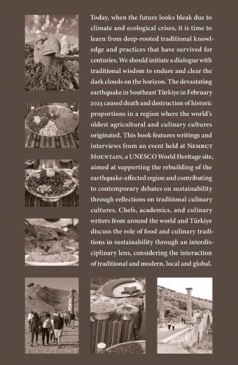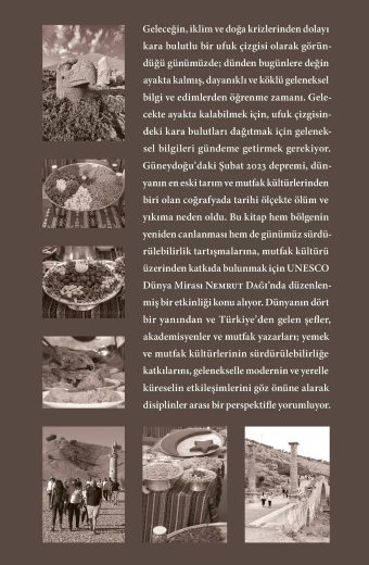 Geleceğin, iklim ve doğa krizlerinden dolayı kara bulutlu bir ufuk çizgisi olarak göründüğü günümüzde; dünden bugünlere değin ayakta kalmış, dayanıklı ve köklü geleneksel bilgi ve edimlerden öğrenme zamanı. Gelecekte ayakta kalabilmek için, ufuk çizgisindeki kara bulutları dağıtmak için geleneksel bilgileri gündeme getirmek gerekiyor. Güneydoğu’daki Şubat 2023 depremi, dünyanın en eski tarım ve mutfak kültürlerinden biri olan coğrafyada tarihi ölçekte ölüm ve yıkıma neden oldu. Bu kitap hem bölgenin yeniden canlanması hem de günümüz sürdürülebilirlik tartışmalarına, mutfak kültürü üzerinden katkıda bulunmak için UNESCO Dünya Mirası Nemrut Dağı’nda düzenlenmiş bir etkinliği konu alıyor. Dünyanın dört bir yanından ve Türkiye’den gelen şefler, akademisyenler ve mutfak yazarları; yemek ve mutfak kültürlerinin sürdürülebilirliğe katkılarını, gelenekselle modernin ve yerelle küreselin etkileşimlerini göz önüne alarak disiplinler arası bir perspektifle yorumluyor.